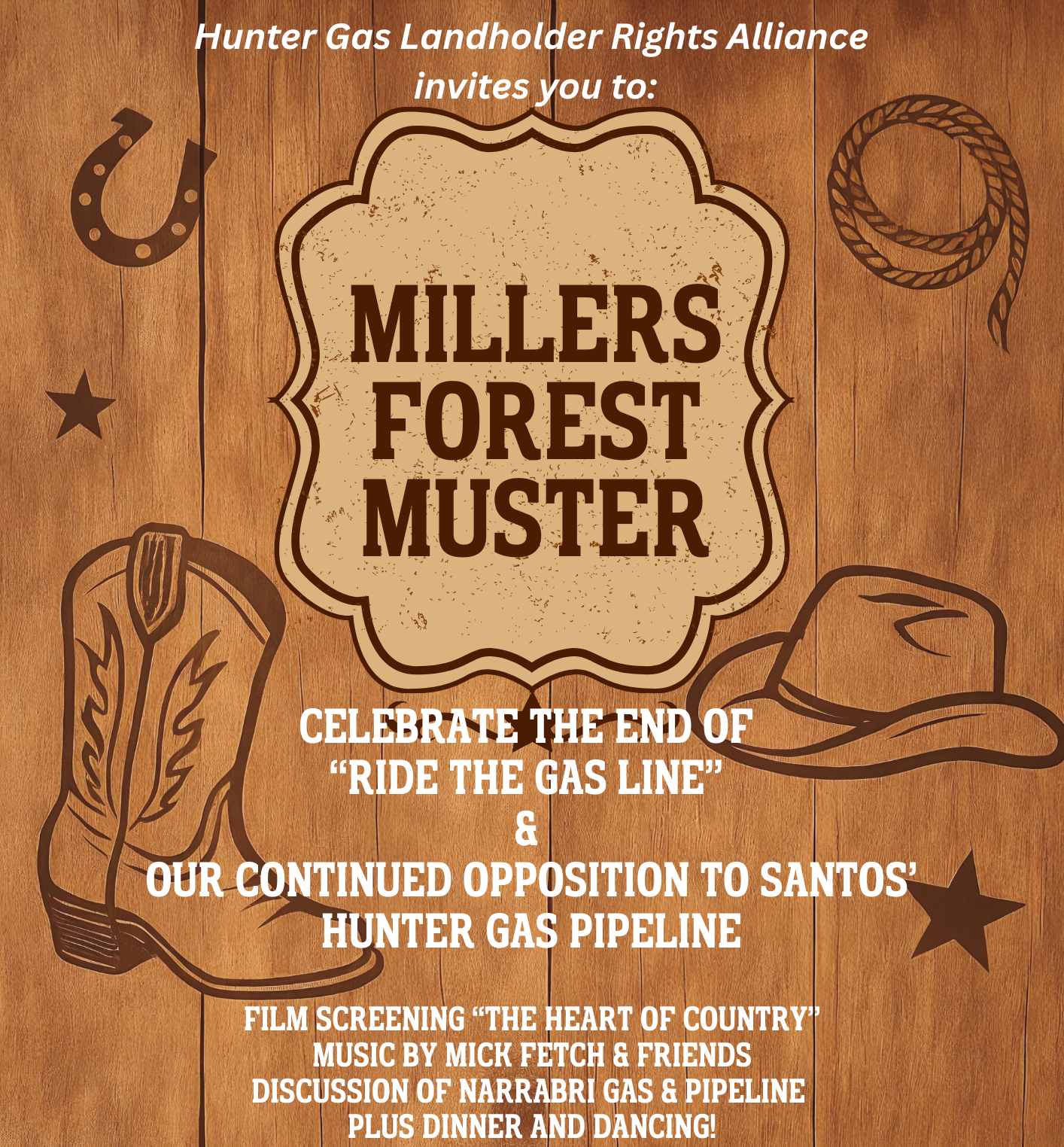 Hunter Gas Landholder Rights Alliance invites you to celebrate the end of "Ride the Gasline" and our continued opposition to Santos' Hunter Gas Pipeline for an action-packed evening of entertainment at the iconic Millers Forest Hall.