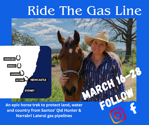 Ride the Gas Line is an epic horseback journey of around 400 km, following the proposed route of the Narrabri Lateral and Queensland Hunter Gas Pipelines.